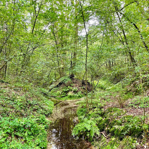 Het laatste stukje van de paarse route leidt ons door een gebied met sprengen. De sprengen zijn ontstaan door menselijke ingrepen. Ze werden gegraven om verschillende soorten watermolens te kunnen bedienen. De eerste spreng die ons pad kruist is een beekje met roestig, bruin, maar kraakhelder water. Op het informatiebord lezen we dat er een zeer zeldzame vissoort in de sprengen leeft, ‘de beekprik’. We zien ‘m niet, deze kaakloze, palingachtige vis. Wellicht dat ie zich ergens warm houdt onder de modder?